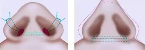分离鼻基底,把三角形假体植入,把鼻翼基底垫起来。这种方法在韩国比较常用。其目的是为了缓冲上颌牙槽骨过突造成的台阶。把直角台阶缓冲成一定坡度,也有两种术式: