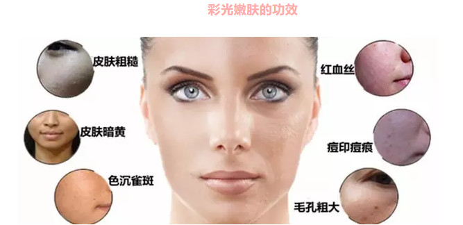 彩光嫩肤能同时解决多种皮肤问题,有效祛除面部瑕疵、色素皱纹、斑点、红血丝等问题, 治疗的同时全面改善肌肤质地,美白嫩肤,增加肌肤弹性和活力,不伤肌肤,不痛不肿,无须休养,不影响正常工作和生活。