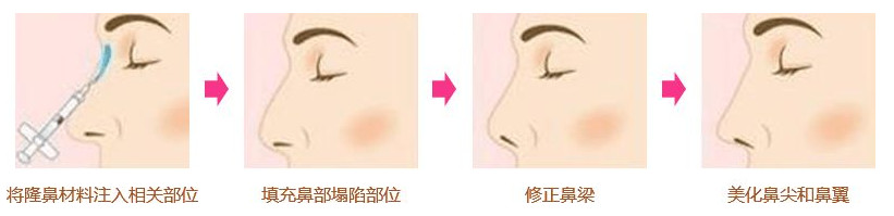 注射隆鼻是用注射的方式隆鼻,通过往鼻子的皮肤组织里填充物质(玻尿酸、自体脂肪、胶原蛋白),从而达到隆鼻效果,不需要切开鼻子的皮肤组织,通过针剂注射的方式就能达到填充的效果,注射时间仅需5到15分钟,术后鼻部会有轻微的红肿,恢复期为24小时到2天不等。