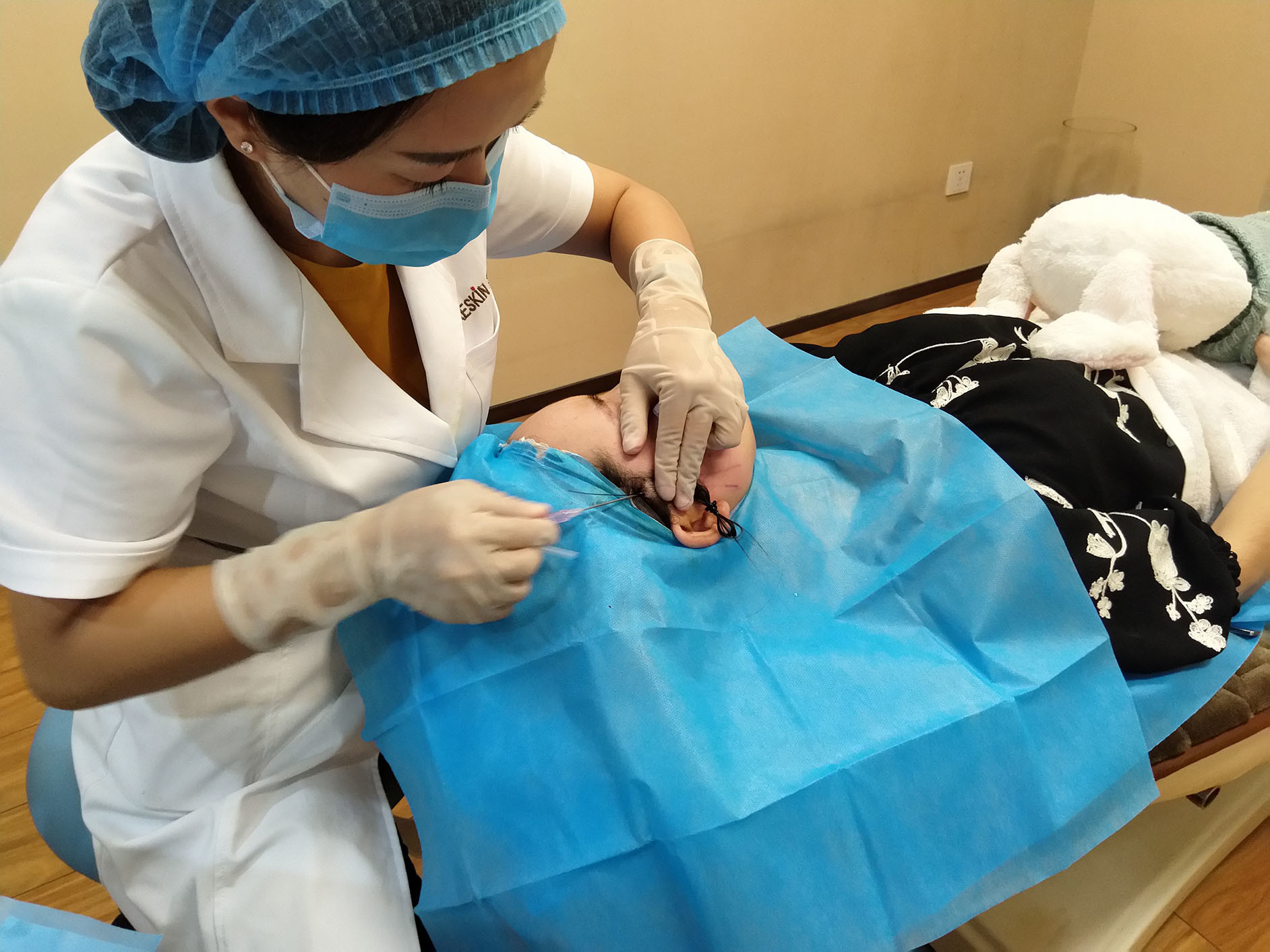 我们在正向埋线基础上结合逆向埋线,再结合晶肤特有的多向布线,在头皮筋膜固定线头,强效对抗地心引力作用,平复颧弓过凸软组织,并进行多余软组织提拉迁移充盈太阳穴。